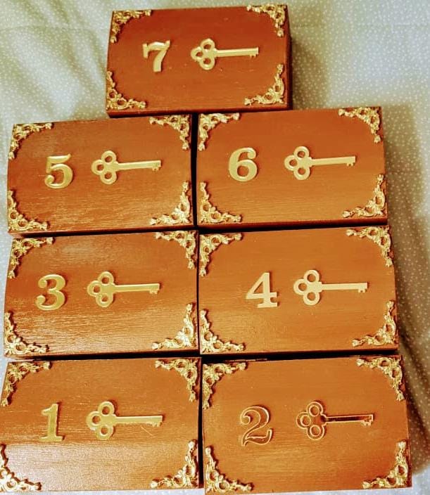 Busquei meus conhecimentos sobre emoções e sentimentos, escolhendo duplas opostas. Em cada bauzinho eu colocaria uma dupla em cores específicas para cada baú. Bolei as cartinhas e procurei uma gráfica para fazer a arte. Também criei o Manual de Uso em forma de pergaminho e um poema para gratificar o jogador. Isto faz parte da gamificação. Estava pronto. Porém o Baú do Tesouro é mágico, guarda um segredo e para fazer o percurso é necessário passar pelas sete chaves.